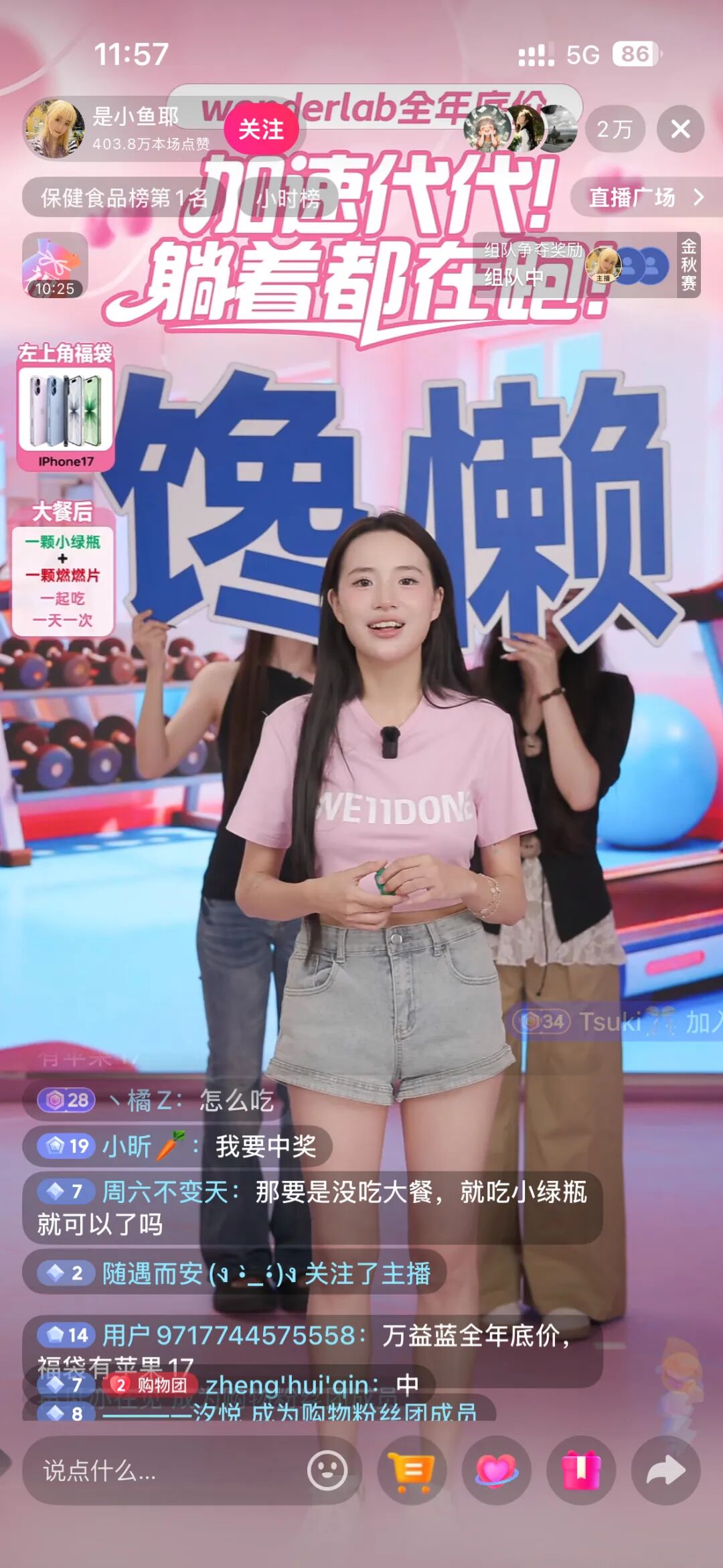 9月25日下午,记者打开抖音搜索“餐前控控片”关键词发现,有抖音达人正进行万益蓝品牌专场直播带货,并将“馋”“懒”两个大字放在直播间作为背景板,营造出“不用控制饮食也能轻松变瘦”的氛围。