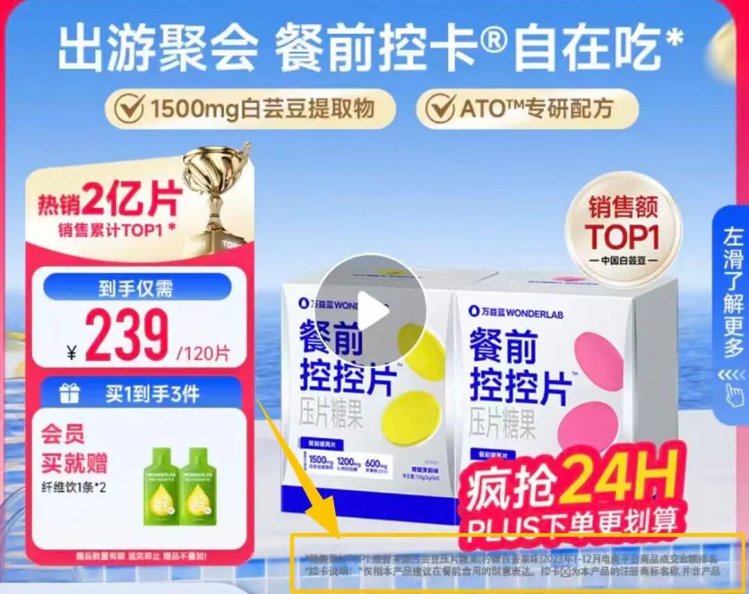 餐前控控片的相关种草视频以“餐前两片,阻隔碳水吸收”为卖点,精准切中减脂人群忌口难、运动累的痛点。据品牌方数据,该产品已是电商平台白芸豆类目销售额第一,累计销售2亿片。